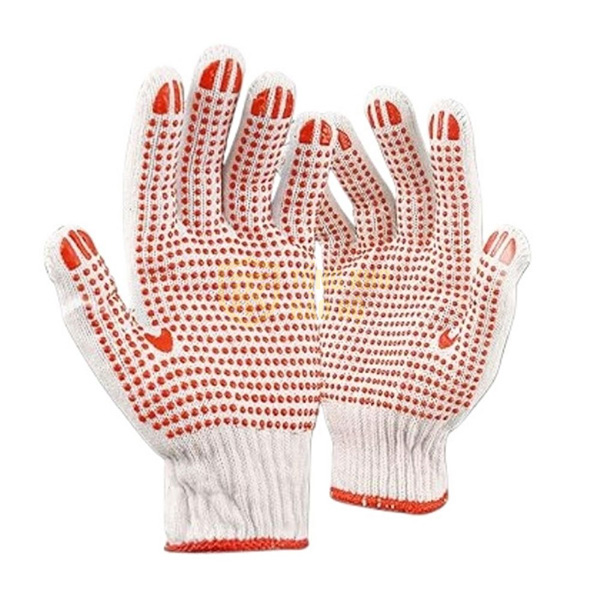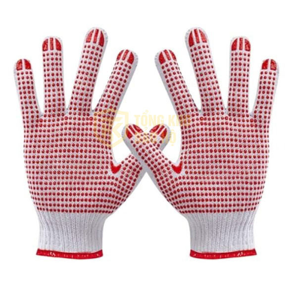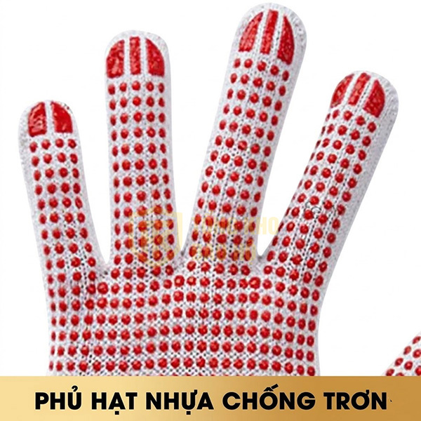 Găng tay len phủ hạt nhựa đỏ chống trượt là găng tay bảo hộ được làm từ chất liệu cotton, len và được phủ một mặt bằng các hạt nhỏ bằng nhựa lòng bàn tay. Các hạt nhựa làm bằng nhựa dẻo PVC tạo độ nhám giúp người lao động dễ dàng cầm nắm, tăng độ bám dính, gia tăng tính an toàn cho đôi tay trong quá trình làm việc. Sản phẩm có đặc tính nhẹ, dễ dàng sử dụng, dễ dàng vệ sinh, tái sử dụng được nhiều lần.